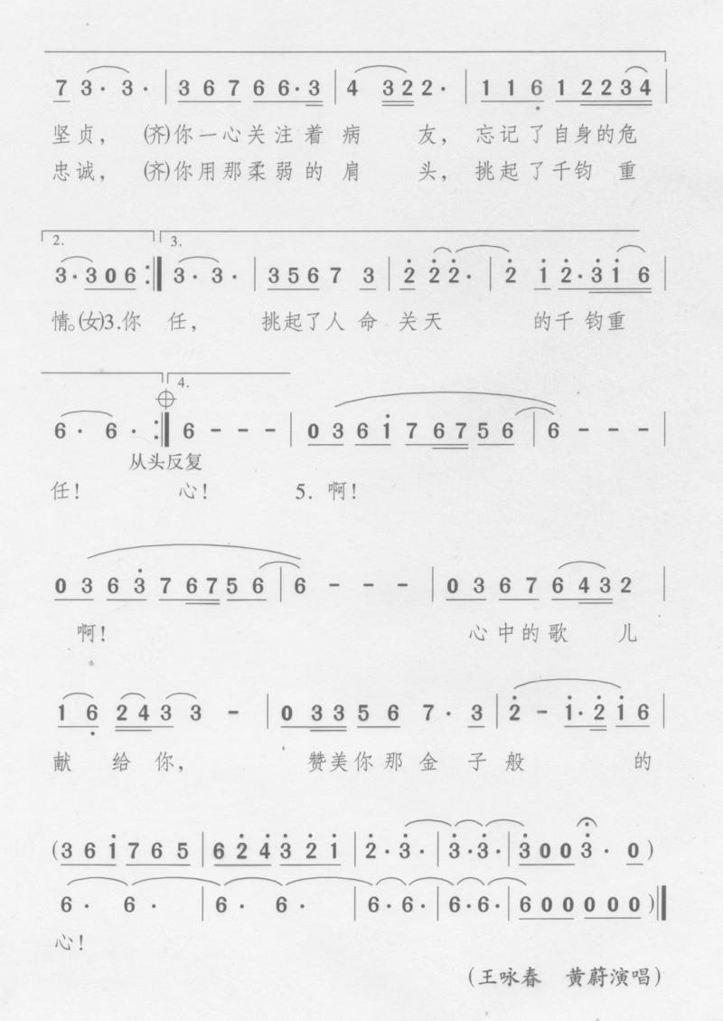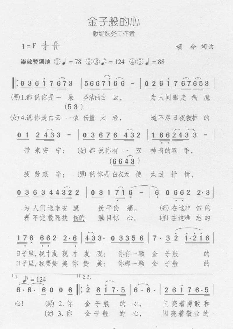 吳頌今在2003年抗擊非典的時候曾經創(chuàng)作了獻給抗擊疫情第一線白衣戰(zhàn)士們的《金子般的心》,這幾天,很多人又在傳唱這首歌。吳頌今說,看到新聞中白衣戰(zhàn)士們勇敢地沖上第一線抗擊疫情的消息,感覺和“非典”時的感動一般無二。本來還打算重新填詞,但仔細看了下,發(fā)現(xiàn)今天想對他們說的話,都在里面,索性原詞照發(fā)。