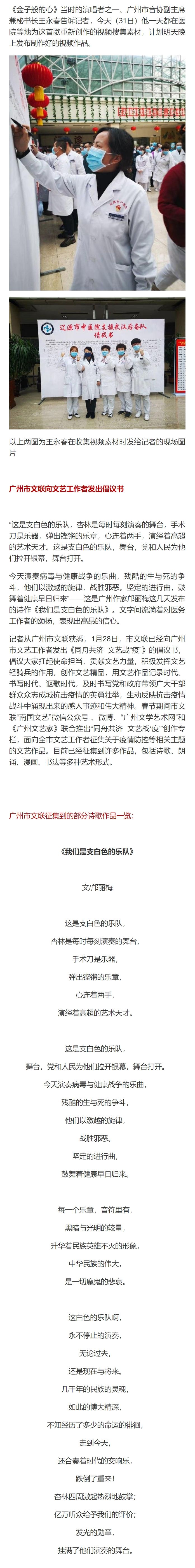 廣東省音協(xié)專職副主席、秘書長金庚旭老師是武漢人為此次抗疫創(chuàng)作了《有一種力量》和《天使的歌唱》兩首歌曲。前者歌頌醫(yī)護人員,后者則是為全社會加油打氣。他在接受媒體采訪時表示,自己本來打算接姐姐一家來廣州過年,今年只能作罷,但人在廣州,心系武漢。他表示,音樂是最能激勵和溫暖人的藝術形式,鼓勵大家創(chuàng)作這樣的歌曲。