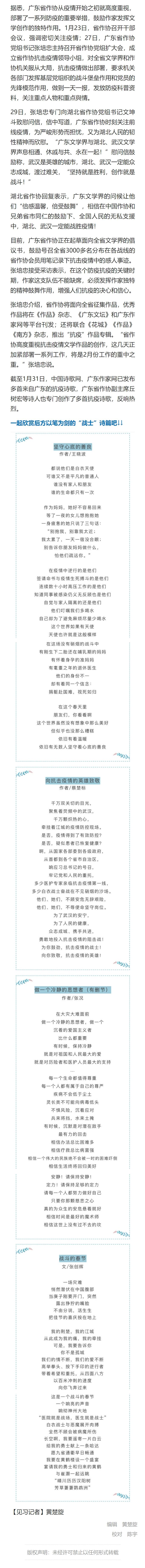 在這個特殊的春節假期里,廣東省內許多作家與詩人一直心系湖北,密切關注前線疫情,并拿起手中的紙筆,為前線抗擊疫情的“白衣戰士”寫下一篇篇詩作。