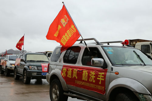 自駕越野車上插上隊旗、裝上喇叭器、調(diào)試音量、張貼標語、列隊前行……當天上午9點左右,20多名身著“龍川汽摩應(yīng)急救援”、戴著口罩的熱心志愿者,為了此次車載廣播公益宣傳工作做準備。之后,醒目的紅色標語和播放著客家山歌、快板廣播的車隊兵分幾路分組從縣城沿江路出發(fā),一路上播放著疫情防控提醒知識的山歌、快板等。