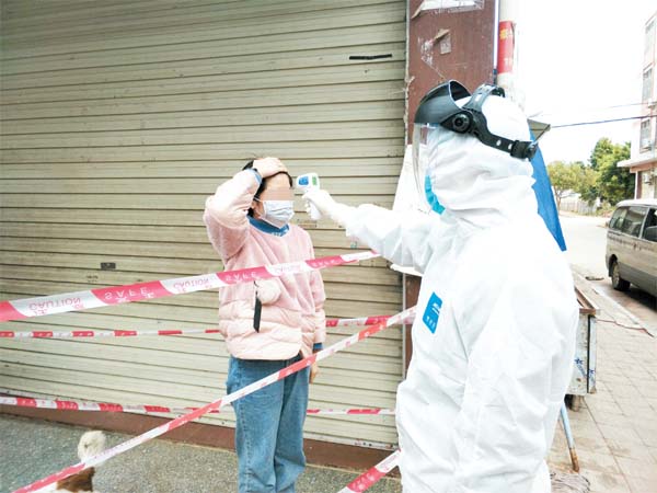 蔡偉雄為居家隔離人員測(cè)量體溫。