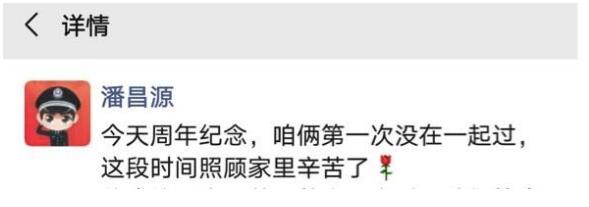 ——2月3日潘昌源朋友圈:今天周年紀(jì)念,咱倆第一次沒在一起過,這段時間照顧家里辛苦了