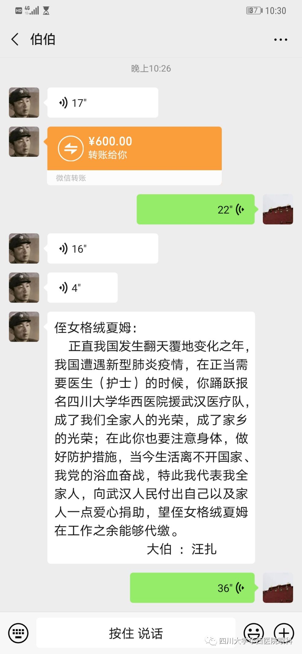 大伯的話句句入骨,充滿正能量。第二天下姆便取消了休假,踏上了返程的道路。從知道醫院招募志愿者開始,她先是參加了我院急診的志愿服務工作;緊接著又去支援我院重癥醫學科的臨床護理工作。2月6日晚,當看到護士長在群里統計志愿申請去疫區一線的消息后,她第一時間報名,并提交了請戰書。1個小時后她接到了護士長的電話,告知被選上去武漢支援了,那一刻她既激動又緊張,沒曾想大伯的囑托竟然真的成為了現實。她立刻打電話告知了大伯去支援前線的事,大伯非常激動和自豪,立即向武漢捐贈了600元錢,希望下姆轉交給當地醫院,并告訴下姆:“正值我國發生天翻地覆變化之年,我國遭遇新型肺炎疫情,在正當需要醫護人員的時候,你踴躍報名四川大學華西醫院援武漢醫療隊,成為了我們全家人的光榮,成了家鄉的光榮。在此你也要注意身體,做好防護措施,當今生活離不開國家,我黨浴血奮戰。特此我代表我全家人,向武漢人民付出自己及家人一點愛心捐助,望侄女格絨下姆在工作之余能夠代繳”。大伯的言語和愛心讓下姆熱淚盈眶。