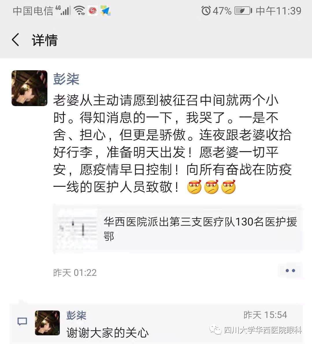 深夜,丈夫在朋友圈留言道:“老婆從主動請愿到被征召中間就兩個小時,得知此消息時,我忍不住哭了,不舍、擔心、但更是驕傲,連夜和老婆收拾好行李,做好隨時出發的準備,愿老婆一切平安,愿疫情早日控制,向所有奮戰在防疫第一線的醫護人員致敬”。