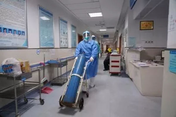 前一天收治的危重病人目前在氧療的支持下生命體征還算平穩,只是我們每隔40分鐘就得換一次氧筒。工作以來病房都是床邊中心供氧,都已不記得什么時候推動過這個“大炮”了!真是挺累的!而且每次還得拿扳手去換,動作不能慢,不然病人的血氧就會往下掉,喘不上氣!一班下來,眼罩內已結滿了霧珠,但只要患者能挺過難關,我們心里一點都不覺得累。
