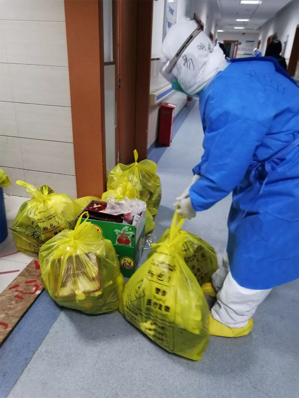 這是來到武漢的第三天,大家還不能完全適應穿防護服工作。胸悶、呼吸不暢,剛上班半個小時,醫療隊就有隊員開始出現惡心嘔吐,迫不得已脫掉防護服出去調整休息。脫防護服的地方十分有限,隊員們2人一組輪流互助脫防護服,每組至少20分鐘,再輪流洗澡離開醫院。回到酒店再次洗澡,坐下來吃飯已是晚上11點多了。雖然辛苦但好在家人現在知道了都很支持,男朋友每天也會和我保持通話,監督我做好防護措施。