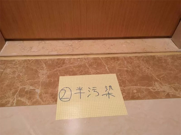 同時,為了避免清潔阿姨進來收撿垃圾時被感染或不小心弄亂劃分區域,我們在門口溫馨提示“垃圾我們自行清出”。