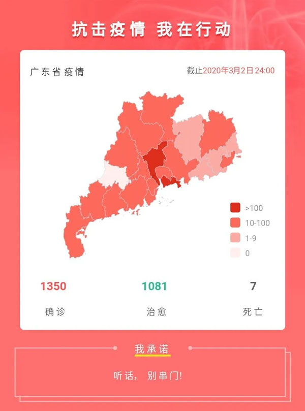 1月21日,廣東舉行首場新冠肺炎疫情防控新聞發布會,成為全國最早一批以省政府名義舉辦發布會的省份。1月23日,廣東省第一時間啟動重大突發公共衛生事件一級響應,迅速隔離病毒,控制疫情蔓延。1月28日,廣東省政府作出企業復工時間不早于2月9日24時的決定,第一時間回應民眾節后返工熱點話題,咱廣東疫情反應速度就是快!