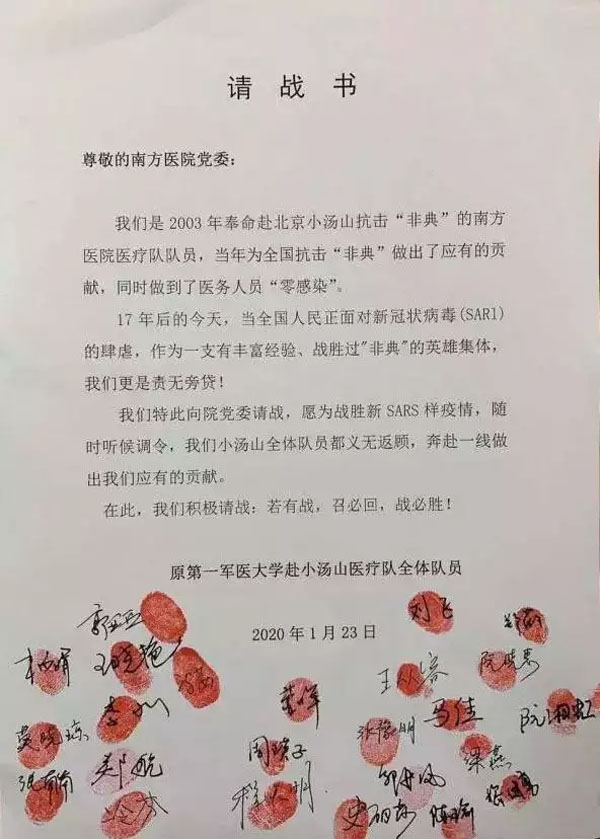 1月24日,除夕夜,當大家還在吃團圓飯的時候,128名廣東醫護人員整裝待發,踏上了支援湖北抗擊疫情之路。截至目前,廣東已先后派出24批醫療隊、2461名醫務工作者馳援湖北,其中不乏17年前抗擊“非典”的白衣戰士,他們都主動請纓奔赴戰場。曾經戰勝非典的南方醫院原小湯山醫療隊寫下戰書,24名隊員全員請戰:“若有戰,召必回,戰必勝!”