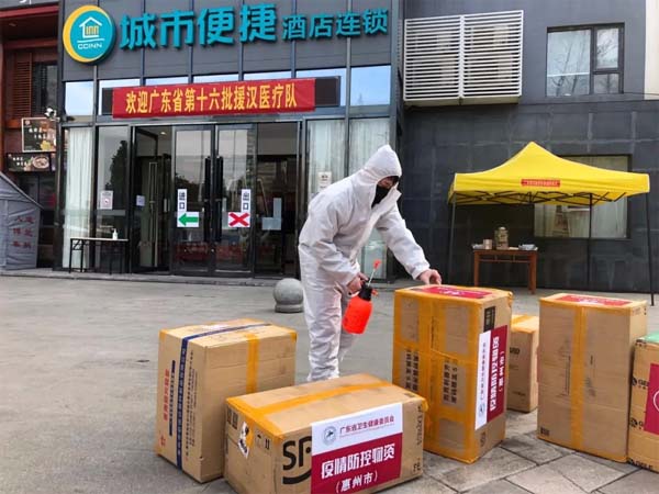 2月15日,城市便捷酒店的店長(zhǎng)王小華連夜開車,從家鄉(xiāng)趕往疫情嚴(yán)重的武漢。她得知酒店被征用為醫(yī)護(hù)人員安置地,急忙趕回為醫(yī)護(hù)人員提供生活服務(wù)。武漢那時(shí)的天氣很冷,她擔(dān)心來自廣東醫(yī)護(hù)人員怕冷,就在他們?nèi)胱∏鞍芽照{(diào)溫度調(diào)好;擔(dān)心洗熱水供給不夠,她就去檢查熱水機(jī)組;擔(dān)心他們吃不慣湖北菜,她還特意請(qǐng)來了一位粵菜師傅。