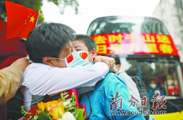 “2個(gè)月前出發(fā)的時(shí)候,我向大家承諾,一定要把全體隊(duì)員一個(gè)不少、毫發(fā)無損地帶回來。”暨南大學(xué)附屬第一醫(yī)院醫(yī)療隊(duì)領(lǐng)隊(duì)、臨時(shí)黨支部書記許典雙激動(dòng)地說:“今天,我領(lǐng)著全體65名隊(duì)員,一個(gè)不少、毫發(fā)無損地回來了!”