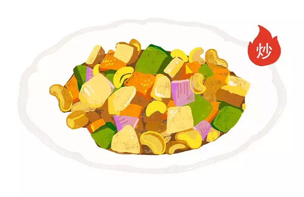 主料:雞肉丁250克、馬蹄丁100克、胡蘿卜丁100克、西芹丁100克、濕冬菇粒50克、腰果100克