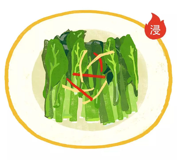 3、熱鍋下油,爆香紅椒絲和姜絲,加水調味后,淋入擺整齊的菜心即可。