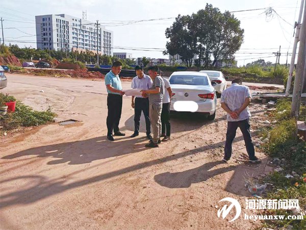 黃路輝(左二)帶領村“兩委”干部查看征地拆遷工作。