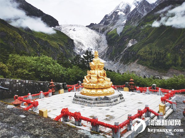 再往上走,正對(duì)著冰瀑的地方有一座泰式木亭和兩座四面佛,周圍鮮花環(huán)繞,這讓我想起泰國(guó)曼谷那萬(wàn)人朝拜的四面佛;路邊還有一座白塔和藏民用石塊堆疊的無(wú)數(shù)個(gè)小瑪尼堆。在冰川上見(jiàn)到這些,似乎見(jiàn)到了信仰的力量。