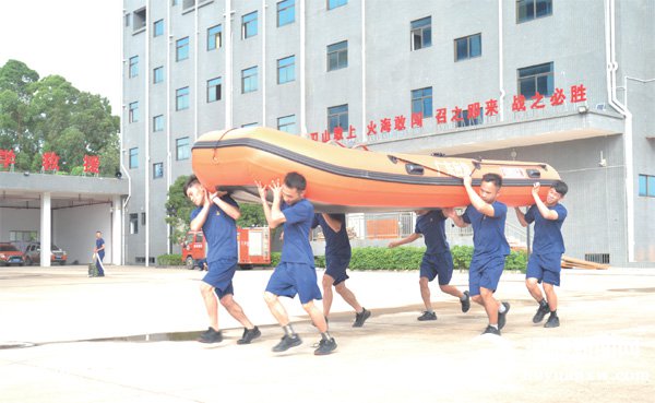 應(yīng)急救援隊隊員模擬接到水災(zāi)災(zāi)情后,抬起橡皮船出發(fā)。