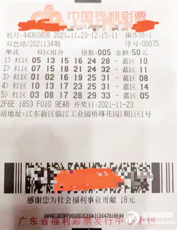 河源一購彩者乘雙色球12億元大派獎東風 斬獲5308萬元巨獎