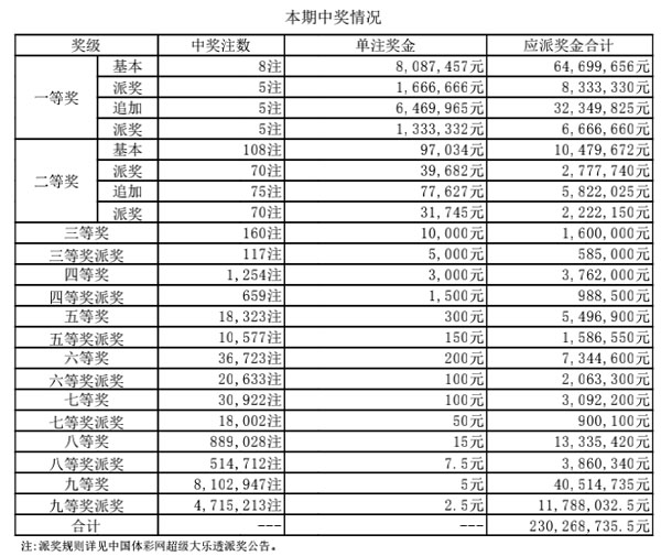 本期全國共中出8注一等獎。5注為1455萬元(含808萬元基本投注獎金+ 646萬元追加獎金)追加投注一等獎,出自河北秦皇島、山東濟南、廣東清遠和新疆烏市(2注),5注全都符合本次派獎參與條件,每注多得一等獎派獎獎金299萬余元,分享派獎獎金后單注總獎金為1755萬余元。另外3注為808萬元基本投注一等獎,出自河北廊坊、安徽合肥、江西九江。