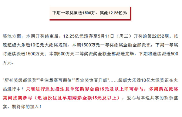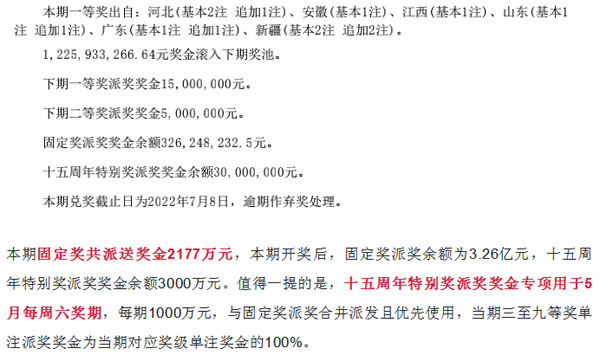 本期二等獎開出108注,單注獎金為9.7萬余元;其中75注采用追加投注,單注追加獎金7.76萬余元。本期共有70注二等獎符合本次派獎參與條件,每注還可多得二等獎派獎獎金7.14萬余元,分享派獎獎金后,二等獎單注總獎金為24.6萬余元。