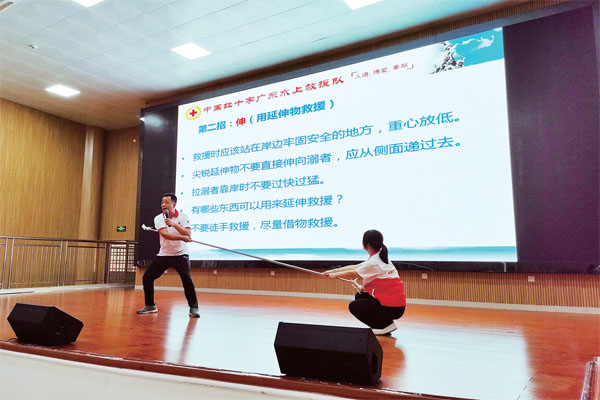 講座中,張培絢用生動(dòng)的語(yǔ)言對(duì)如何辨識(shí)溺水風(fēng)險(xiǎn)隱患、如何避免溺水事故發(fā)生、如何科學(xué)有效救護(hù)等問(wèn)題進(jìn)行了講解,并通過(guò)與志愿者的互動(dòng)演練,向現(xiàn)場(chǎng)觀眾演示如果遇到溺水事件,該如何利用身邊的繩子、水桶、竹竿等用具開(kāi)展正確有效的施救。