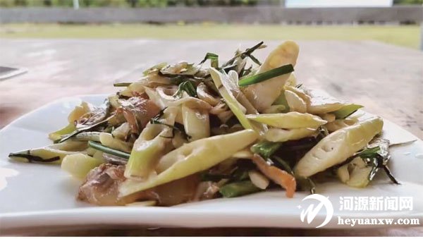據了解,棚竹筍可炒、可燉、可熬湯,具有低脂、低糖、高纖維等特點。在庭院內,只見曾憲彬揪松筍尖,隨后剝殼,筍衣繞指旋上幾圈,鮮嫩的筍肉隨即露出。洗凈筍肉后,曾憲彬將棚竹筍切成塊,鍋底熱油、蒜頭熗鍋,不一會兒,柴火灶頭就充滿煙火氣息。備好的五花肉煸炒出味兒,再倒入棚竹筍炒至斷生,肉的油滑與筍的清新互相碰撞、交融,香味讓人食欲大增。曾憲彬說:“五花肉炒棚竹筍,特別香!棚竹筍一年就產20天左右,清明前后這段時間就是最好的食用期了。”