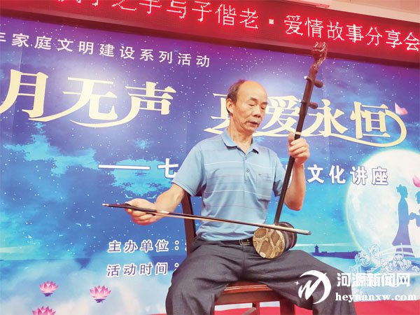 革命后代張靖芳、曾運(yùn)梅夫婦的老家在革命老區(qū)東源藍(lán)口長(zhǎng)江頭咸水塘,結(jié)婚45年,一直互敬互諒,婚姻美滿。夫婦倆早年從咸水塘到市區(qū)謀生,攜手開(kāi)過(guò)飯店、辦過(guò)油坊,靠著勤勞持家,2007年在紫河橋附近蓋了新房,居住至今。如今,兒女們已成家立業(yè),閑下來(lái)的張靖芳喜歡拉二胡,成立了社區(qū)樂(lè)隊(duì),經(jīng)常在紫河社區(qū)義務(wù)演出,成為遠(yuǎn)近有名的拉二胡“一把好手”。這次夫妻倆帶著孫子一同參加此次活動(dòng)。張靖芳二胡獨(dú)奏《夫妻雙雙把家還》博得滿堂彩,又即興演奏一曲《婚誓》,全場(chǎng)掌聲雷動(dòng),喝彩連連。他拉二胡有一手,經(jīng)營(yíng)婚姻自有“竅門”。張靖芳說(shuō),結(jié)婚靠緣分,幸福靠經(jīng)營(yíng),互敬互諒方能白頭到老。幸福生活就是一句話,不管生活多艱難,也要疼愛(ài)自己的老婆。