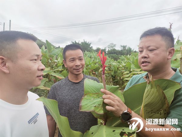 慈向鋒(右一)向陳文斯(右二)了解芭蕉芋生長情況