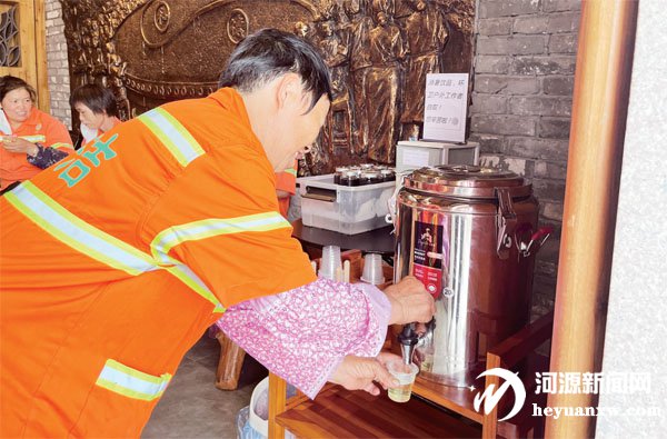 環(huán)衛(wèi)工人在愛心驛站歇息喝水。