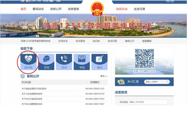 (二)網站:打開河源市人民政府門戶網站,從“政民互動”版塊進入“12345政務服務便民熱線”欄目,點擊“面對面”按鈕,掃碼登錄后,根據提示要求輸入內容并提交(網址:http://www.heyuan.gov.cn/hd/)。