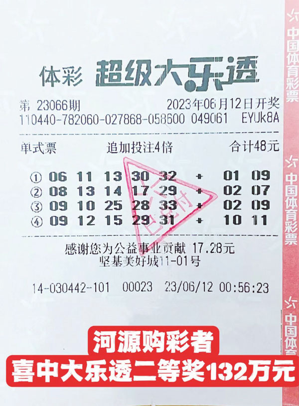 本報訊 記者 吳心怡 通訊員 李超嵐 6月12日,體彩超級大樂透第23066期前區開出號碼“06、11、13、30、32”,后區開出號碼“01、03”。位于我市堅基美好城11-01號的4414030442體彩實體店傳來喜訊,一幸運購彩者喜中第23066期體彩超級大樂透二等獎4注,狂攬132萬元獎金,為我市稅收貢獻26.4萬元。
