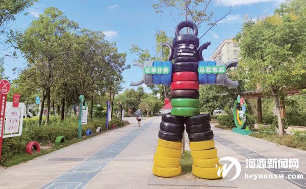 走進主題公園,一個用輪胎搭建而成的巨形機器人讓人眼前一亮,變廢為寶的理念在這里完全體現出來。公園內隨處可見設計新穎的垃圾分類宣傳標語和標識,不少造型新穎的工藝品分布在公園的各個區域,且所有工藝品都是采用廢棄物品制作而成。