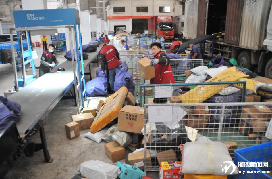 “春節(jié)前夕,這里最高峰有5萬件左右的量。春節(jié)期間,降為約3萬件左右的量。”胡俊生說,東源電商物流中心的快遞以發(fā)往鄉(xiāng)鎮(zhèn)為主,目前大多數(shù)都是禮盒裝的年貨和衣服。