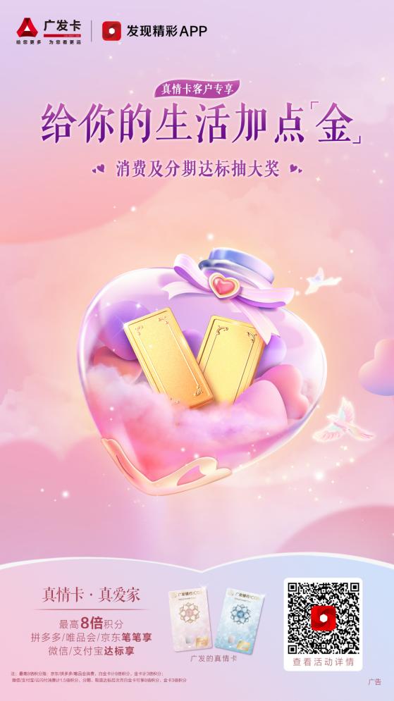 實體商業人氣回暖,線上零售增勢不減。線上線下共同激發消費活力,在今年將迸發出新的勢頭。廣發信用卡堅持把助力恢復和擴大消費擺在優先位置,不斷強化消費信貸對消費的支持,深耕場景建設,加速多樣化的服務供給出“給你的生活加點金”主題活動,為專屬客群量身打造高倍積分、組團抽消費金,全力支持消費回暖。廣發真情卡堅持20多年真情守護,近日再次服務升級,推、 “金”條禮贈等全新福利,以積分獎勵促消費循環、以組團分享激發消費潛力,助力消費提振。
