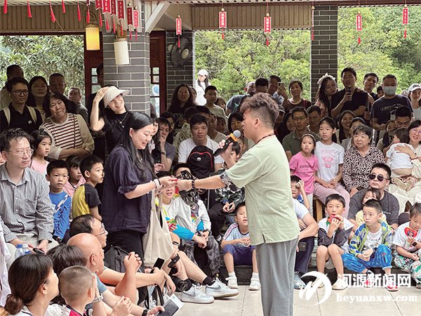萬綠湖景區工作人員與游客互動。