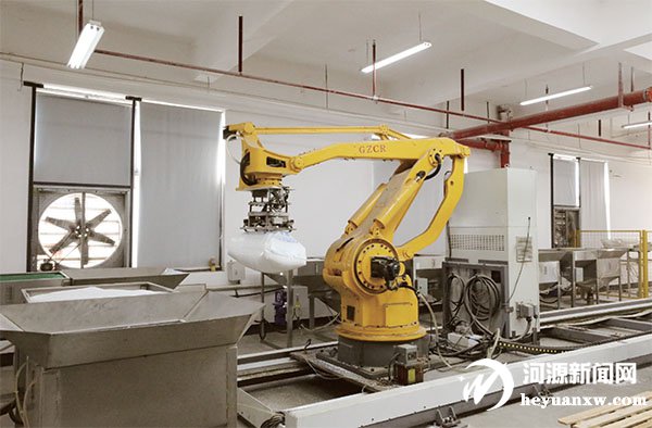 在上料區域,一臺五軸機器人熟練地將袋裝原材料抓取并運至料槽上方,通過機械手開袋,將原料準確倒入槽中。聚盛模具總經理雷霆介紹,該設備為公司自主研發成果,經多年技術積累而成,不僅顯著提高工作效率,也解決了原材料頻繁搬運的難題。這臺機器人可24小時不間斷運行,即便在無照明的“黑燈”環境下仍能穩定作業。