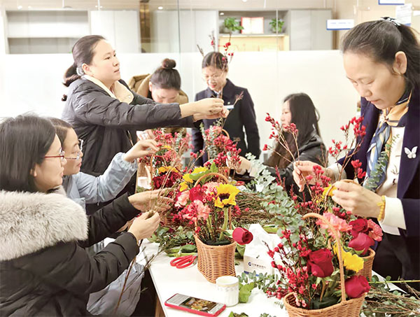 在建設銀行河源市分行勞動者港灣,一場別開生面的插花藝術活動如約而至。受邀參加的女性客戶在花藝師的指導下,創作出一束束鮮花作品,將對美好生活的向往與祝福融入其中,活動現場洋溢著歡聲笑語。