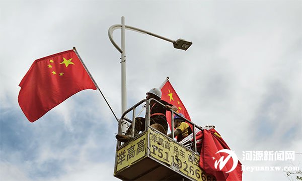 近日,在市區沿江路路段,工作人員正搭乘高空作業車輛,認真細致地將國旗懸掛在指定位置,一面面五星紅旗迎風招展,國慶喜慶氛圍濃厚。