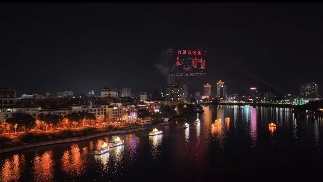 此次魚(yú)燈夜游活動(dòng)以水、陸、空為平臺(tái),以“魚(yú)燈”為筆,以“客家文化”為魂,精心打造了一場(chǎng)融合“水、陸、空”多維體驗(yàn)的非遺盛宴。夜幕降臨,伴隨著主題曲《江湖漁火映河源》的悠揚(yáng)旋律,近20艘船只在新豐江上緩緩巡游,恰似水中游龍,靈動(dòng)而壯觀。隨后,無(wú)人機(jī)、“水上火壺”“飛龍飛鳳”等空中表演,與河源文化廣場(chǎng)分會(huì)場(chǎng)的煙花表演聯(lián)動(dòng)綻放,演繹出火樹(shù)銀花、水火共舞的絕美場(chǎng)景。在新豐江畔,巡游隊(duì)伍手持非遺魚(yú)燈一路前行,并與沿途的非遺表演團(tuán)隊(duì)、圍觀游客熱烈互動(dòng)。大家伴隨著音樂(lè)節(jié)奏擺動(dòng)身體、歡呼雀躍,形成了壯觀的“人河燈海”景象,現(xiàn)場(chǎng)氣氛熱烈非凡。
