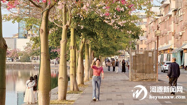 記者看到,在源城區鱷湖公園,兩旁道路披上粉妝,綿延數百米的異木棉絢爛綻放,為城區增添了一抹亮色。姹紫嫣紅的異木棉花吸引了不少市民群眾駐足欣賞、拍照打卡。