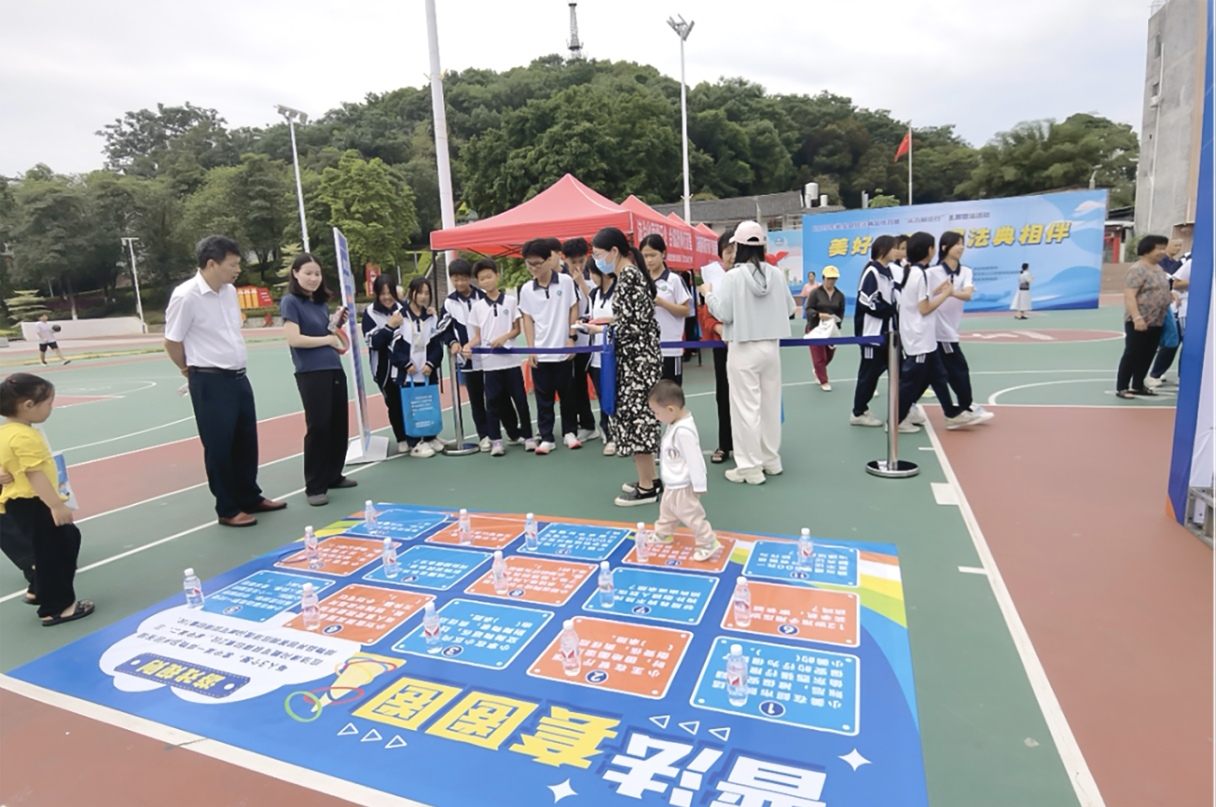 活動創新設置三大互動區,將法律知識融入游戲環節:“法治大轉盤”以直徑一米的彩色轉盤吸引參與者答題集章;“法治套圈圈”通過套中目標物解鎖民法典知識點,圍觀群眾助威聲不斷;“普法投籃”則讓學生在投籃競爭中學習法律條款。參與者集齊3枚印章即可兌換法治宣傳品,現場歡聲笑語,學法氛圍濃厚。